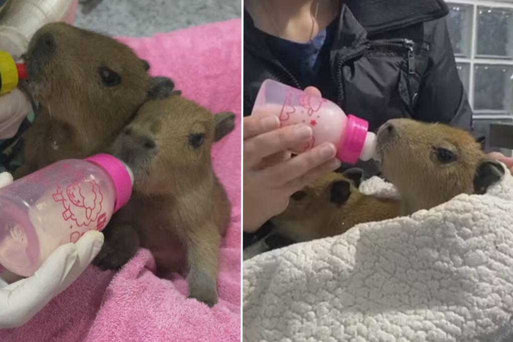 Dois filhotes de capivara foram resgatados na Via Dutra após a morte da mãe e irmãos. Estão recebendo leite na mamadeira e cuidados especiais até poderem retornar à natureza.