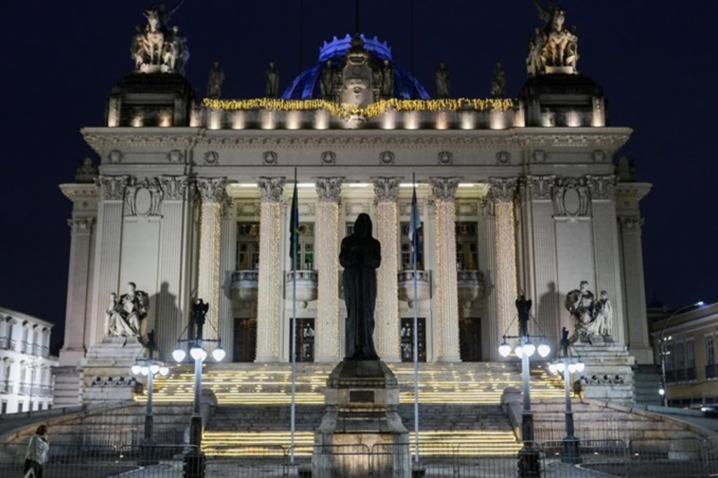 O Palácio Tiradentes ganhou iluminação especial de Natal, valorizando sua arquitetura histórica, incentivando visitas guiadas e reforçando seu papel cultural no Centro do Rio.