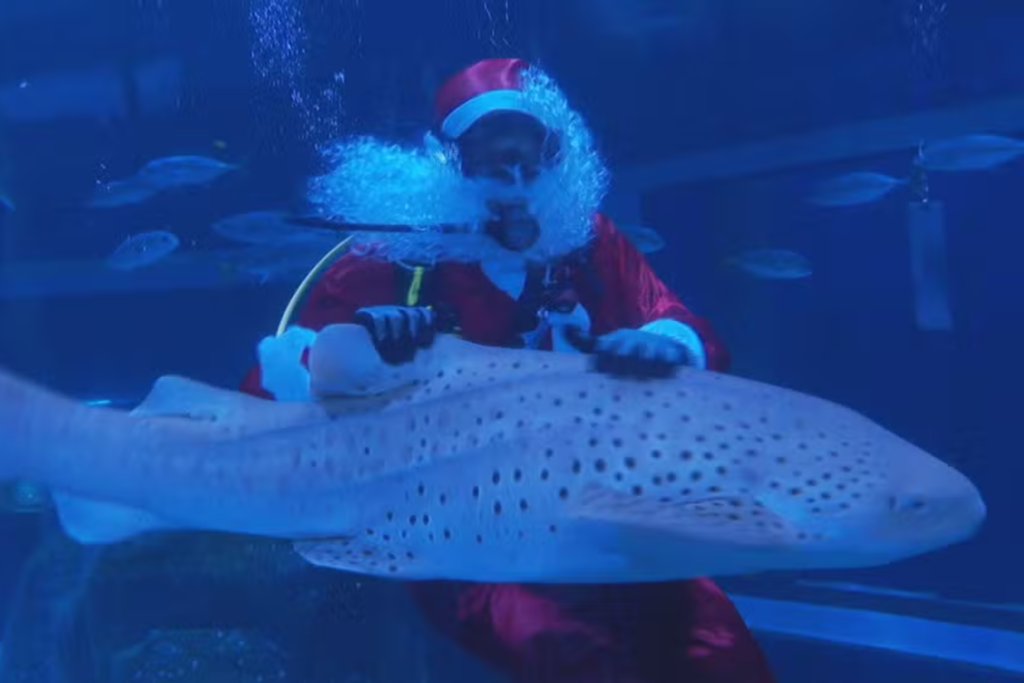 Papai Noel mergulhador se refresca no AquaRio e celebra marca histórica de 1 milhão de visitantes