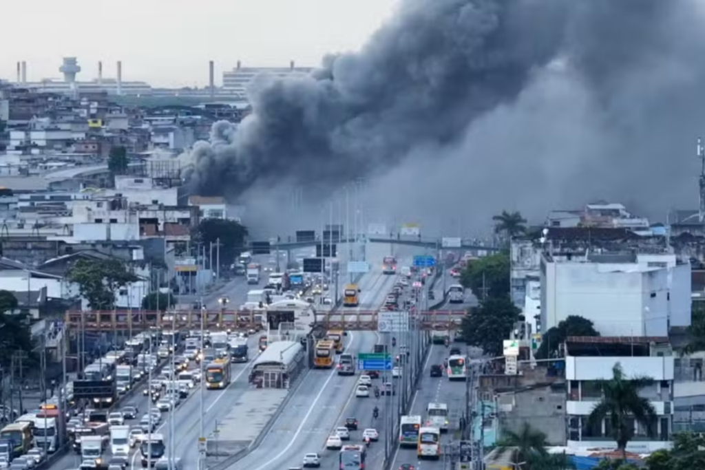 Enquanto isso, uma grande coluna de fumaça preta se espalhou pela região. A fumaça avançou em direção à Avenida Brasil e chamou atenção de motoristas.