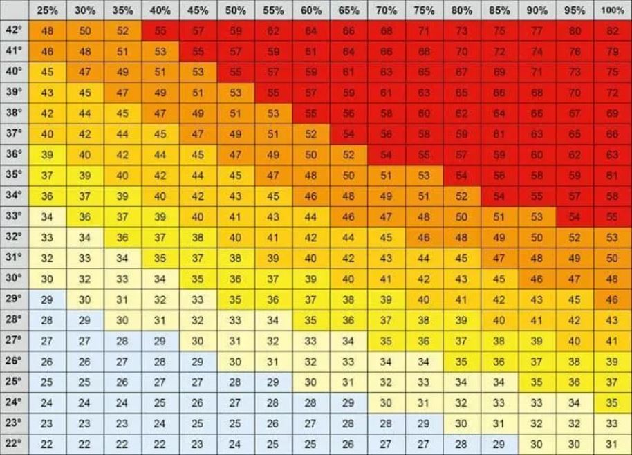 Tabela de cálculo da sensação térmica: acima, está indicada a umidade relativa do ar; à esquerda, a temperatura em graus célsius / Núcleo de Climatologia Aplicada da Universidade de São Paulo (USP)