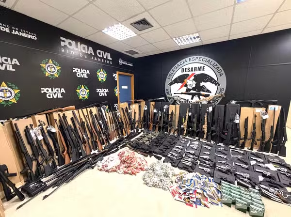 A Polícia Civil do RJ apreendeu 160 armas de fogo e quase 8 mil projéteis em um estabelecimento comercial em São Gonçalo, na Região Metropolitana do Rio, na noite desta quarta-feira (8). A ação foi realizada pela Delegacia Especializada em Armas, Munições e Explosivos (Desarme).