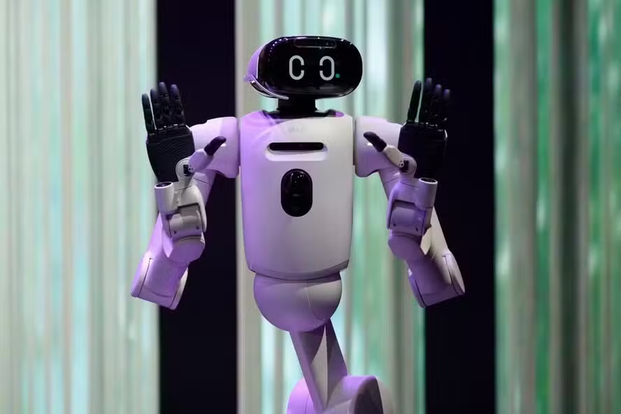 Um dos exemplos mais comentados foi o CLOiD, robô apresentado pela LG Electronics. Com cerca de 1,5 metro de altura e uma tela digital no lugar dos olhos, o humanoide atravessou o palco, acenou ao público e colocou roupas em uma máquina de lavar — lentamente, mas de forma funcional.