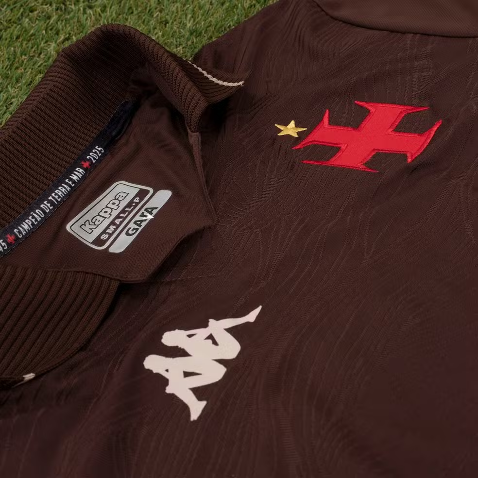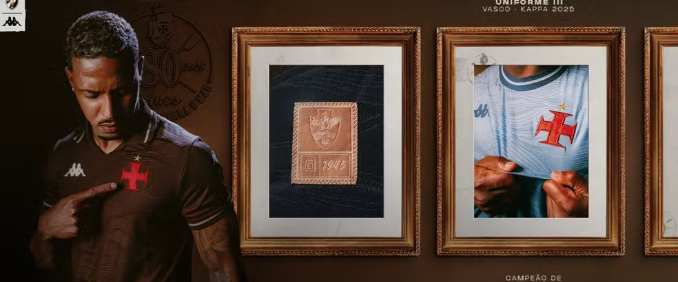 O Vasco da Gama apresentou nesta sexta-feira (17) o seu terceiro uniforme para a temporada 2025/2026. A nova camisa de linha é marrom, enquanto o uniforme de goleiro vem na cor azul claro. O design presta homenagem aos 80 anos do título de “Campeão de Terra e Mar”, conquista que marcou a história do clube em 1945, quando o Vasco foi campeão invicto tanto no Futebol quanto no Remo.